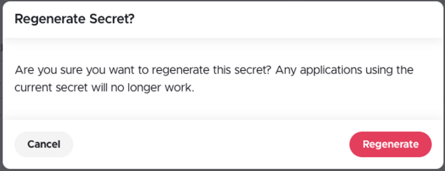 A confirmation popup will be displayed to prompt you to confirm you wish to regenerate the secret. Select the “Regenerate” button.
